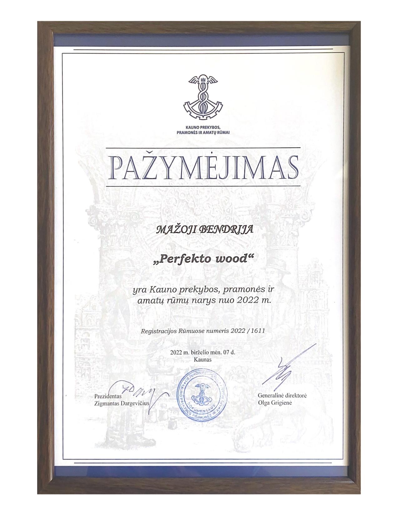 Yes. PerfektoWood received the Strongest in Lithuania certificate from Creditinfo in 2023, 2024, and 2025. We are also a member of the Kaunas Chamber of Commerce, Industry and Crafts.