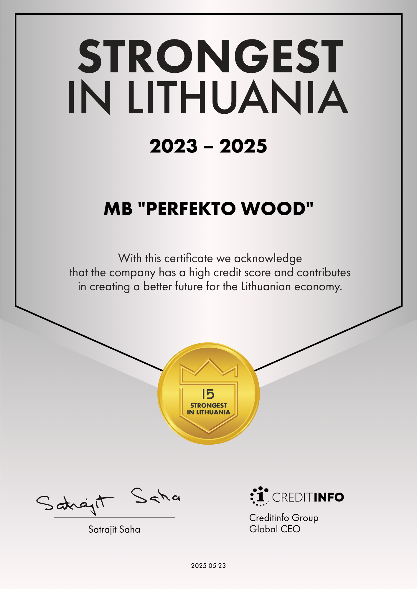 PerfektoWood was awarded the Strongest in Lithuania certificate in 2023, 2024, and 2025. This award is issued by the credit bureau Creditinfo to financially reliable companies with a strong credit history. It is one of the most respected business awards in Lithuania, recognised by international partners.