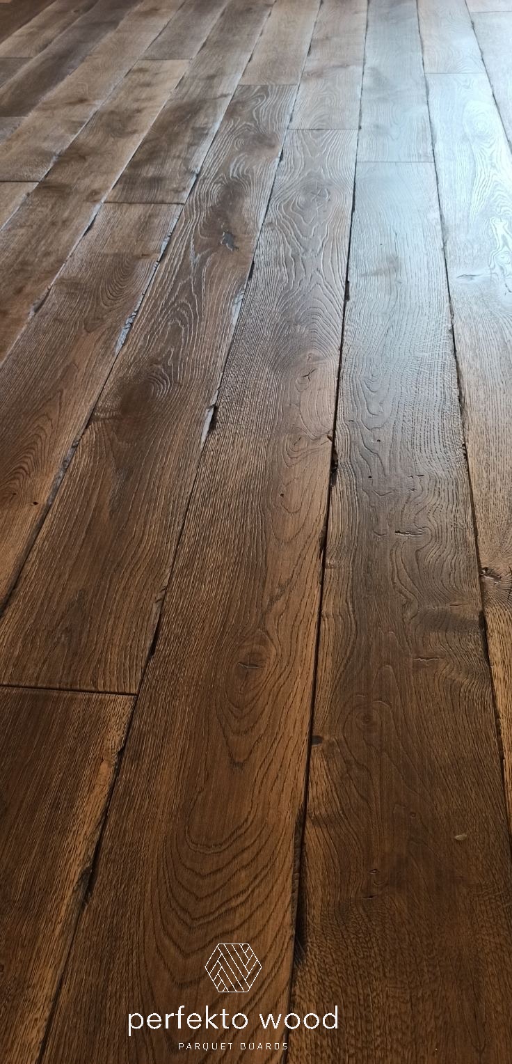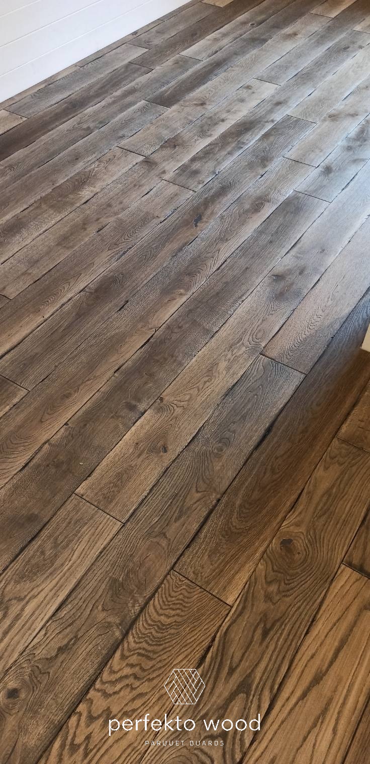 PerfektoWood offers oil, lacquer, and hardwax oil finishes for aged oak flooring, depending on the desired appearance and durability requirements. Custom colour options are also available.