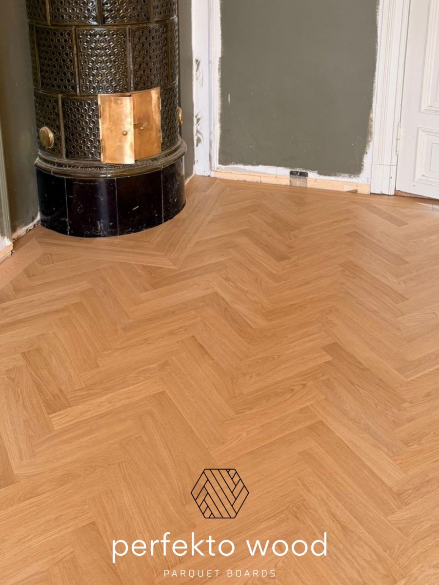 Solid Oak Herringbone Parquet in Latvia — Rustic Grade 16×68×408mm | PerfektoWood
