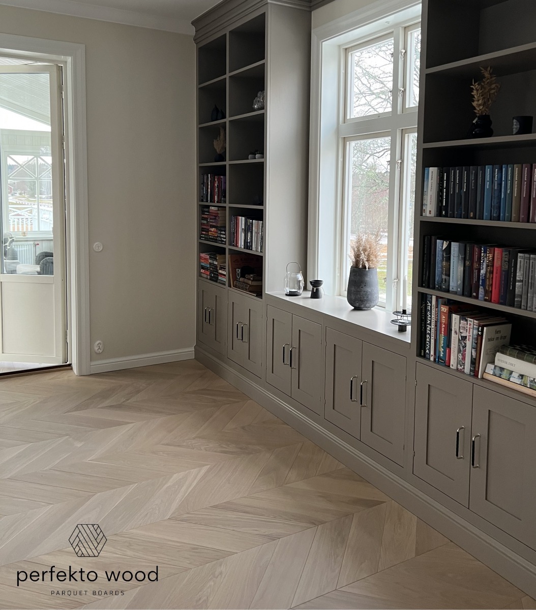 Solid Oak Herringbone Parquet Flooring in Helsingborg, Sweden — Rustic with Sapwood 16×68×408 mm | PerfektoWood Project