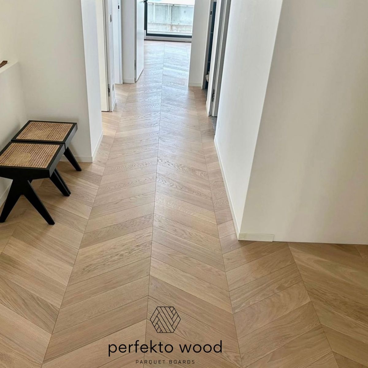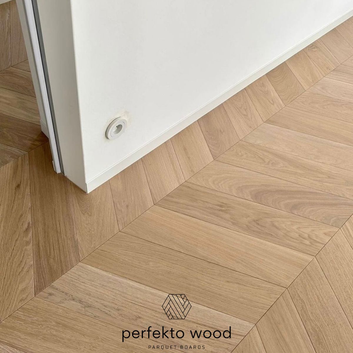 Chevron 60° parquet is a flooring pattern where wooden boards are cut at a 60-degree angle and installed to create a sharp, continuous V-shaped design. PerfektoWood manufactures engineered oak chevron parquet in Kaunas, Lithuania for residential and commercial projects across Europe.