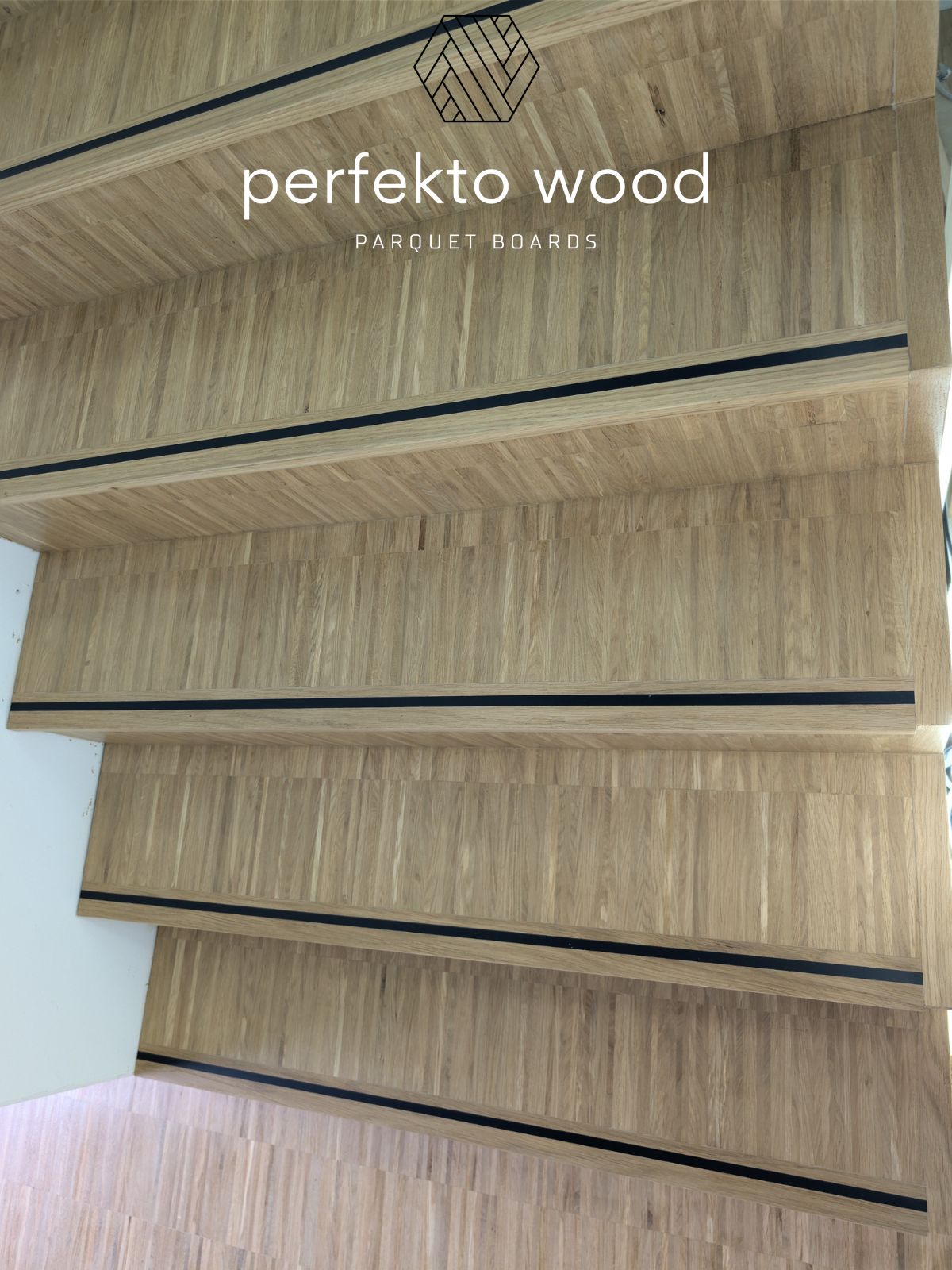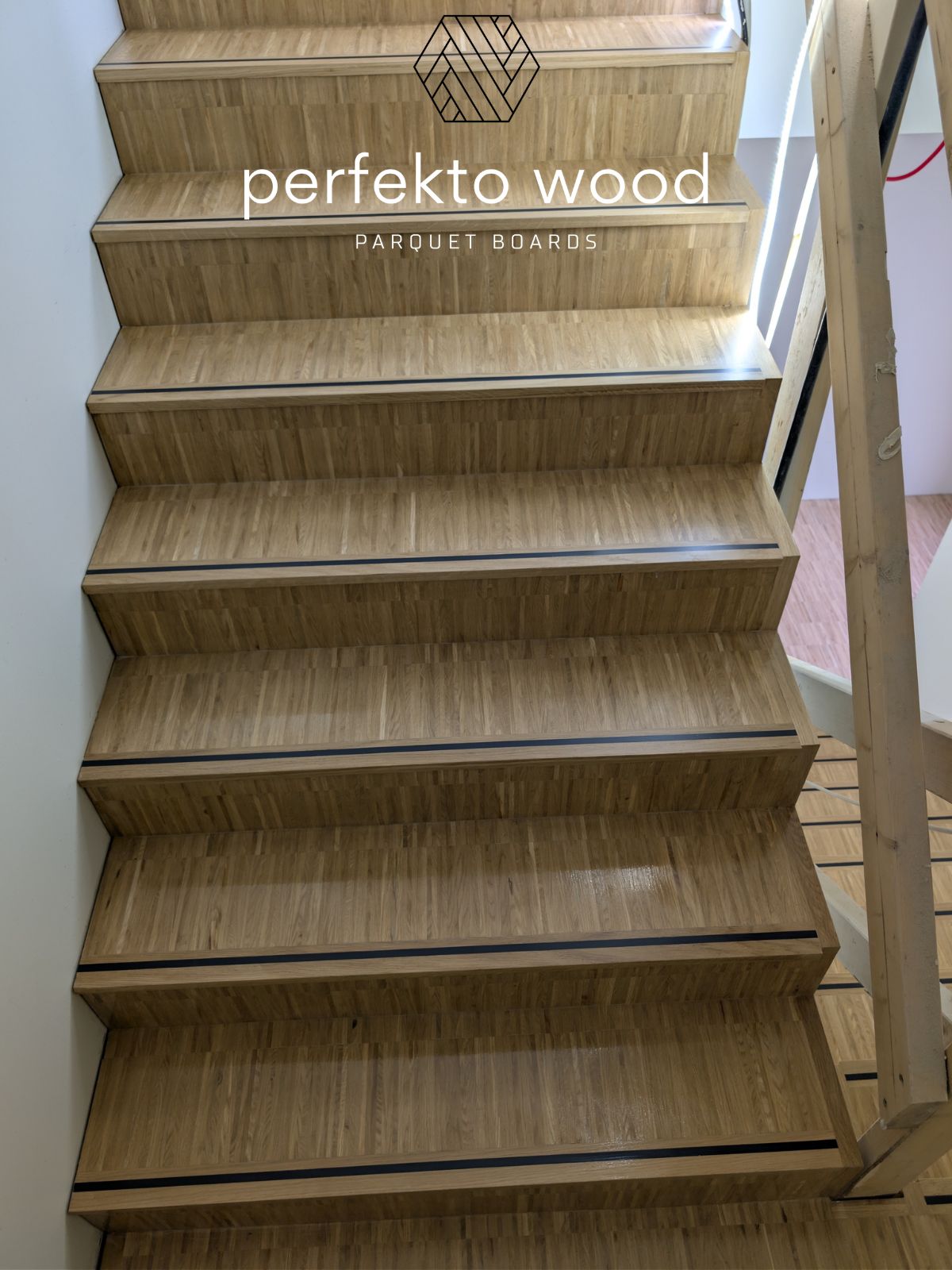 PerfektoWood supplied solid oak industrial parquet for stair cladding in a project in Oslo, Norway. The 16×8×160mm industrial parquet offers high durability, modern Scandinavian aesthetic, and cost efficiency compared to traditional solid oak stair steps.