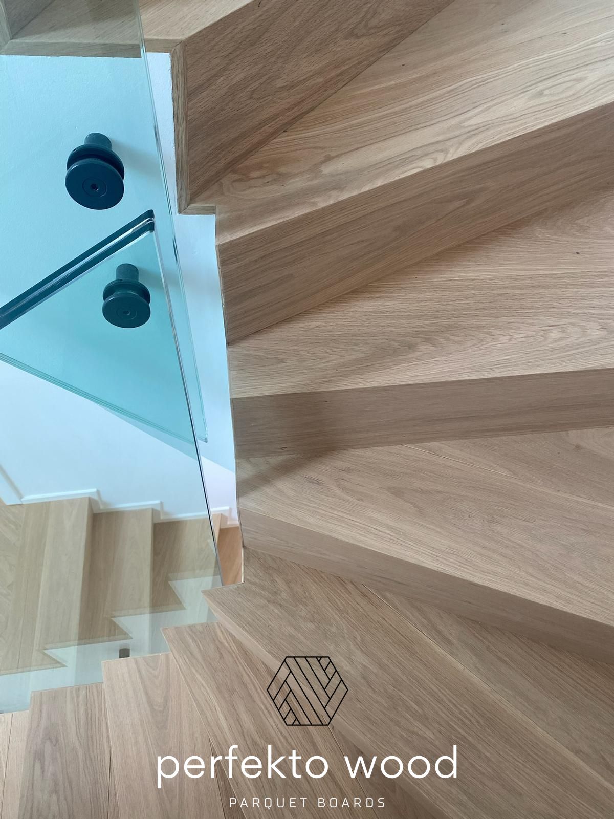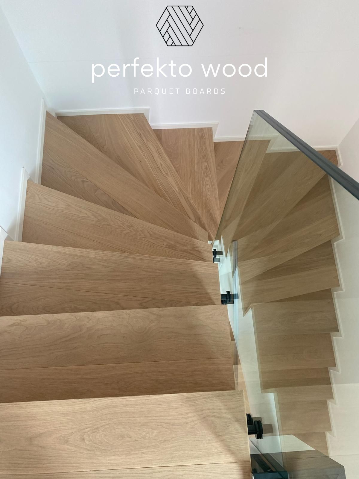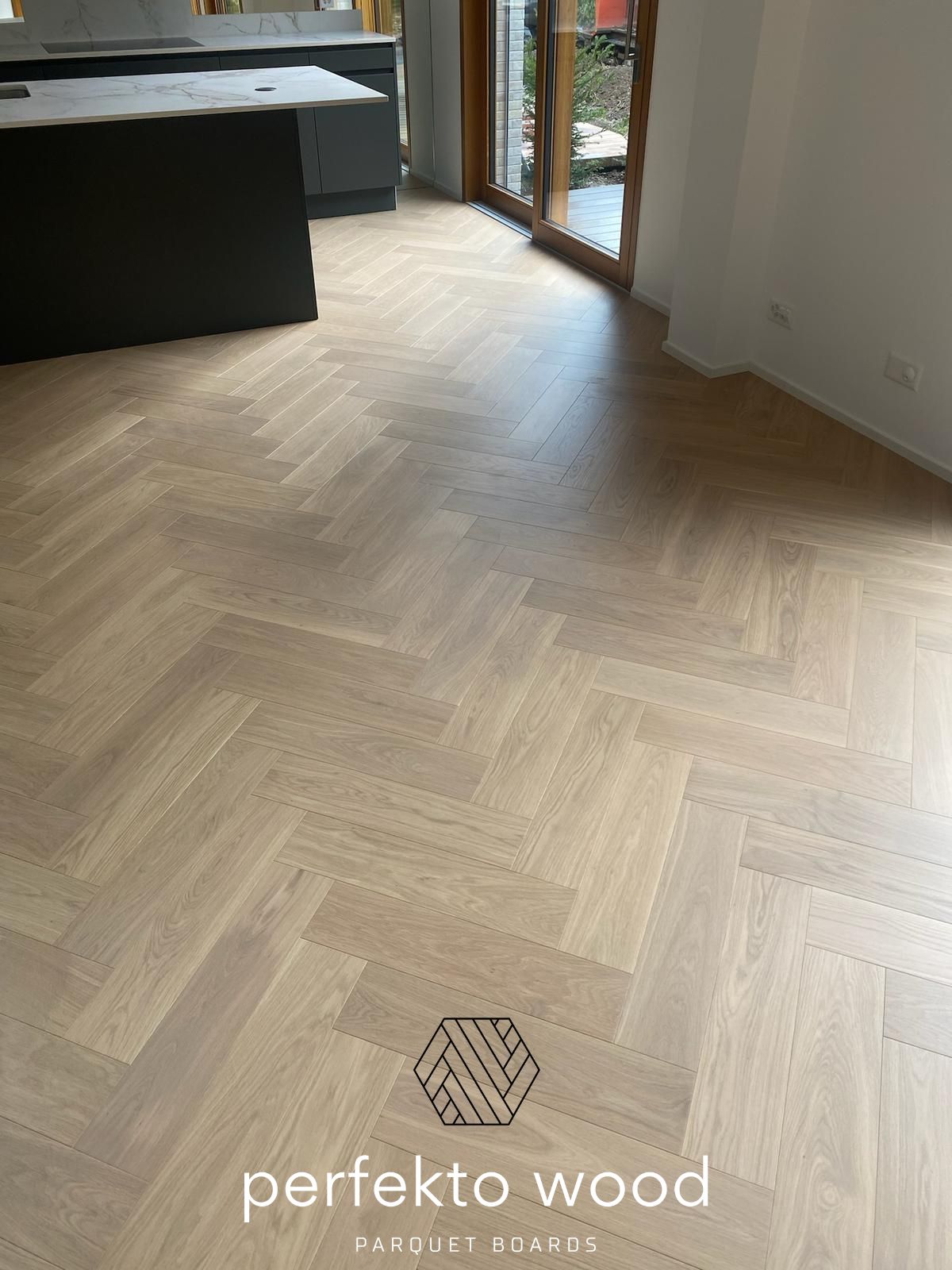 It is engineered parquet made of a 3mm natural oak top layer bonded to a 9mm birch plywood base (total 12mm). PerfektoWood manufactures it in Kaunas, Lithuania for residential and commercial projects across Europe and Switzerland.