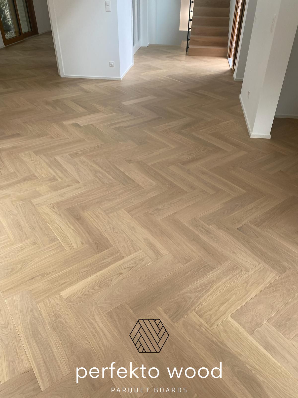 PerfektoWood supplied engineered oak herringbone parquet for a residential project in Geneva, Switzerland. The project features select grade European oak in Biscuit colour, sanded and UV oiled, with 4-side bevel and 12×140×595mm format — creating a timeless and sophisticated Swiss interior.