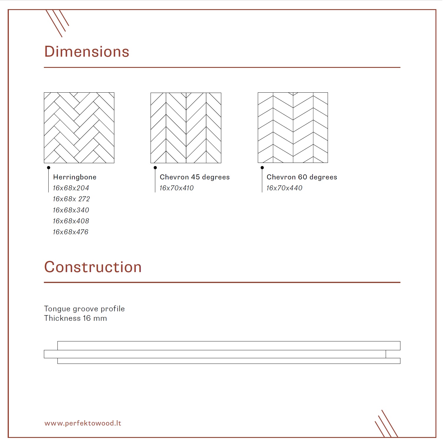 PerfektoWood herringbone parquet blocks are available in lengths from 204 mm to 612 mm, with 16 mm thickness and widths of 68 mm as the most popular combination for classic herringbone layouts.